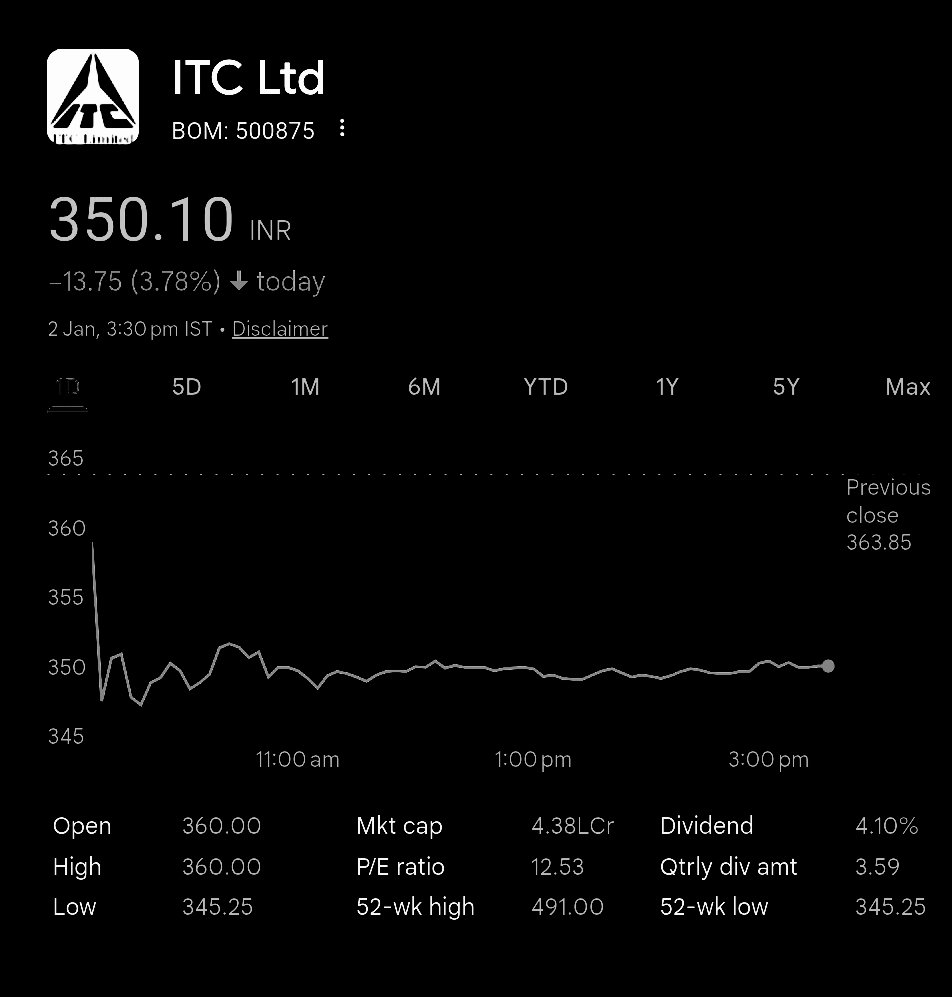 ITC Share Fell Sharply on Thursday Morning around 10 % in a Single Trading Session Followed by another Consecutive Fall on Friday ; nearly 4 % , Creating a 52 Week Low , nearly Rs 345.25.
